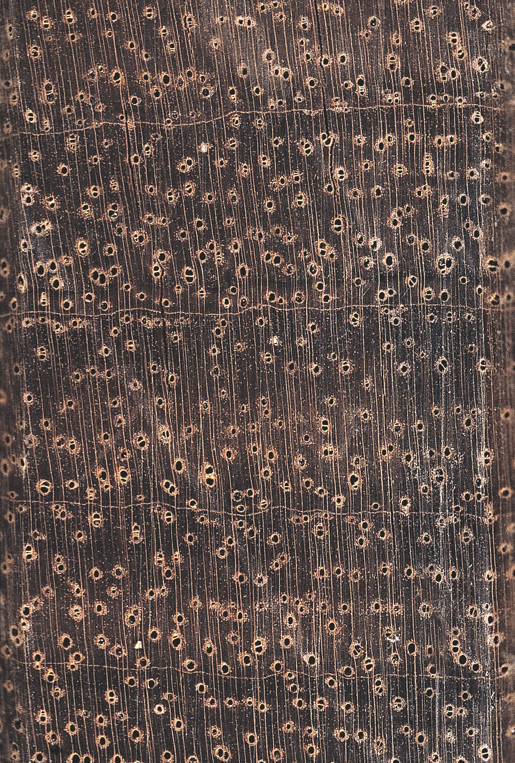 | Farbe und Struktur | Kernholz hell- bis dunkelbraun, oft mit einer leicht violetten Tönung und dunkler Farbstreifung, deutlich abgesetzt vom cremefarbenen Splint. Zuwachszonen makroskopisch erkennbar, begrenzt durch feine marginale Parenchymbänder. Holz von mittlerer bis grober Textur und einer leicht glänzenden Oberfläche; Faserverlauf mit Wechseldrehwuchs. Trockenes Holz ohne charakteristischen Geruch. Das Kernholz fluoresziert gelblich unter UV-Licht. |